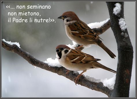 Due passeri non si vendono forse per un soldo? Eppure nemmeno uno di essi cadrà a terra senza il volere del Padre vostro. Perfino i capelli del vostro capo sono tutti contati. Non abbiate dunque paura: voi valete più di molti passeri!